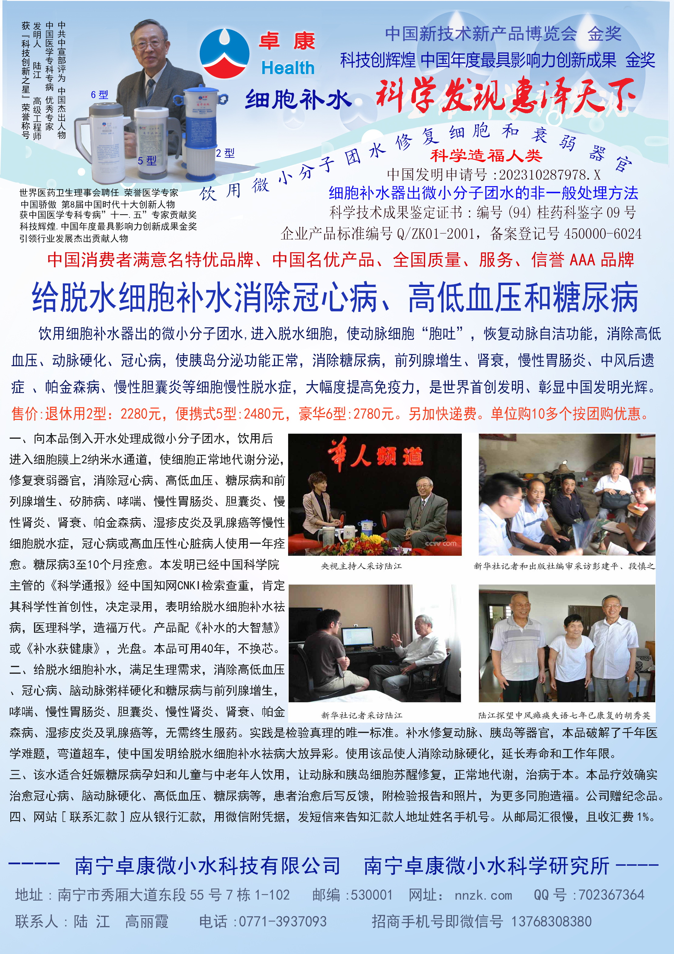 人類幾千年來患以上病癥需終生服藥,幾十年也不能治愈。可是我國南寧的高級工程師陸 江,于1990年想根治高血壓,研究發(fā)明了離子水瓶,處理出微小分子團水供飲用,經(jīng)過醫(yī)院臨床試用和專家鑒定,1999年獲中國發(fā)明專利權(quán),產(chǎn)品于2000年投放市場后一直跟蹤調(diào)查,據(jù)全國各地用戶反饋:祛除了高低血壓、糖尿病和冠心病,并使前列腺增生、咽喉炎、鼻竇炎、慢性氣管炎、支氣管炎、矽肺病、哮喘、慢性胃炎、腸炎、慢性膽囊炎、慢性腎炎、腎衰、膀胱炎、便秘、痔瘡、風濕性關(guān)節(jié)炎和濕疹皮炎及中風后遺癥等病癥不藥而愈。為什么喝微小水能治20多種病?陸 江從1991年德國科學(xué)家發(fā)現(xiàn)細胞膜水通道僅為2納米獲得啟發(fā),認為多種器官患病是因細胞脫水,不能正常代謝和分裂增殖,才使器官細胞減少致衰弱萎縮而形成細胞缺水性病癥。22年來的實踐有力地支持了“細胞脫水致病”這一重要論點,表明喝微小水可滿足細胞的生理需求,補水就能祛病,是生命科學(xué)新亮點。